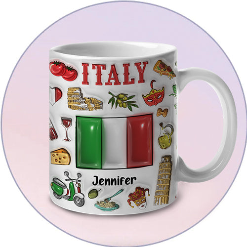 The design is so charming and captures all the iconic landmarks like the Colosseum, Pisa Tower, and the Venice canals. The little scooter and olive branch details are a perfect touch. I also really appreciate that it's personalized with a name, 'Elizabeth,' which makes it a fantastic souvenir or gift.